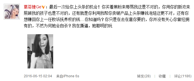 15日凌晨,葛荟婕微博再度发文炮轰汪峰,怒斥:“最后一次给你上头条的机会!你用你的新欢来照顾我的孩子也是不对的。