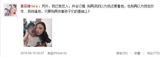 随后,葛荟婕晒出与男性友人亲密照,自曝已有恋人并会订婚,称别再误以为她还爱着汪峰,并喊话:“我祝福他,只要别再伤害孩子们的基础上!”
