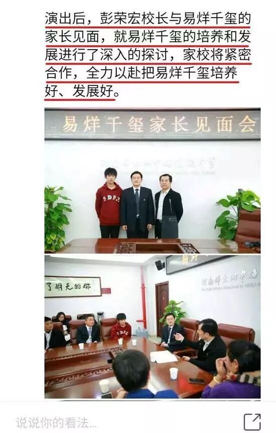 同是TFBOYS成员的易烊千玺现在是湖南师大附中梅溪湖中学的高三学生。去年12月,易烊千玺在学校的文化艺术节献歌提字,校方给千玺和千爸单独安排了一个家长见面会,就千玺的培养和发展进行了深入的探讨……