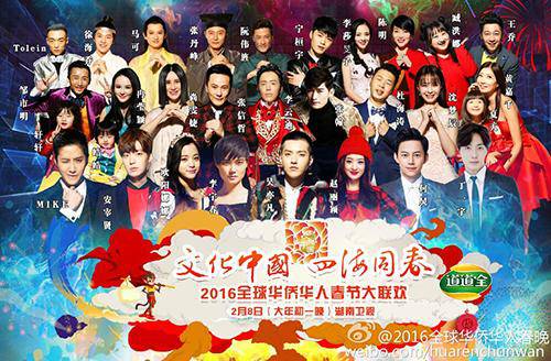 全球华侨华人晚会由国务院侨务办公室授权湖南卫视承办,邀请了众多当红明星,如张信哲、李宇春、尚雯婕、赵丽颖、吴亦凡、张翰、安宰贤(韩国)、MIKE(泰国)、丁一宇(韩国)等海内外艺人,他们一起向全球华人华侨送上精彩的演出。