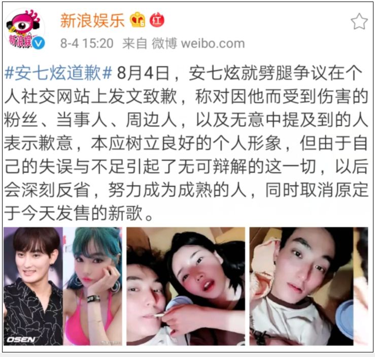 而安七炫则在社交媒体上致歉,并取消原定于今天发售的新歌。