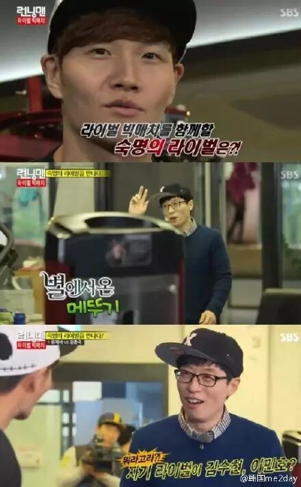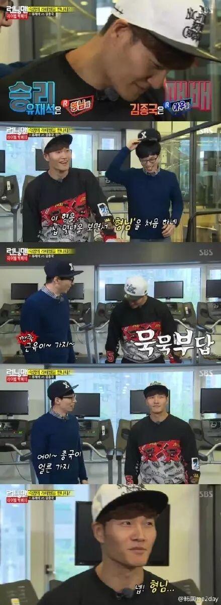 【综合】[金钟国终于叫刘在石"大哥"了]29日播出的<Running Man> "对手Big match"篇中,金钟国被问到"你觉得谁是你的对手?",能力者回答"金秀贤不知道时间方便不.或者李敏镐",制作组"……".而这时刘在石作为金钟国的对手登场,刘赫"我就是金秀贤",全场爆笑.两人展开对决,赢的人就进入"哥哥"队,反之输的就进入"弟弟"队.结果刘在石赢了,金钟国表示"我和这哥哥认识十几年了第一次叫他'大哥'".今天出场的嘉宾有SJ金希澈-利特,EXID HaNi,林耀焕,洪榛浩等.