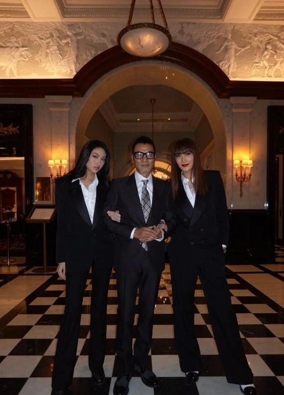 任达华和名模妻子琦琦一左一右站在女儿身边,笑容满面