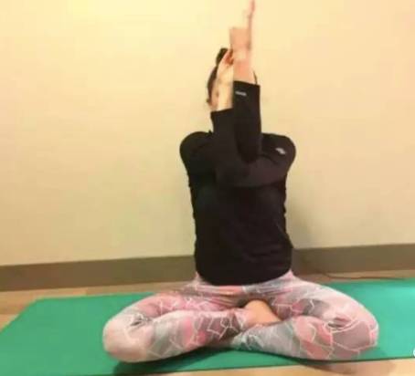 ②右手肘在左手肘下方,双手臂缠绕手心并拢;