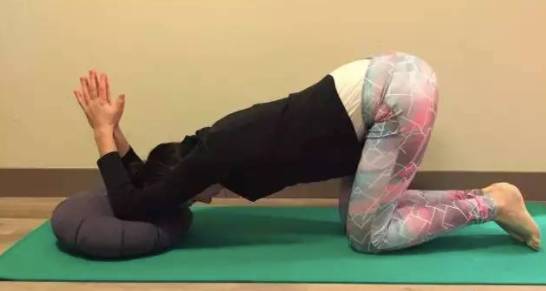 ①膝盖着地,分离与髋同宽,头顶放在垫子上;