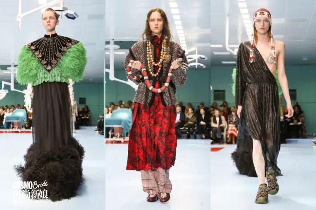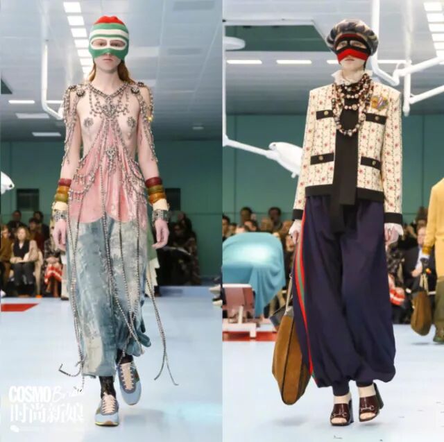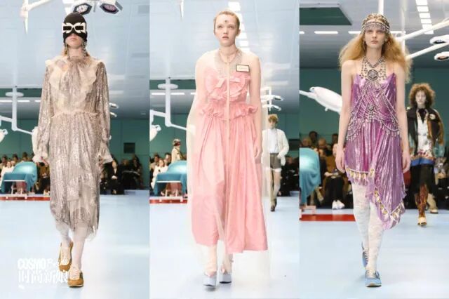 整个秀场被布置成手术室,设计师Alessandro Michele脑洞大开,以“时尚塞博格,混种多元认同”为主题,挑战半机械化或是超人类的概念。因此你能在很多衣服上看到异域风情和神话元素。
