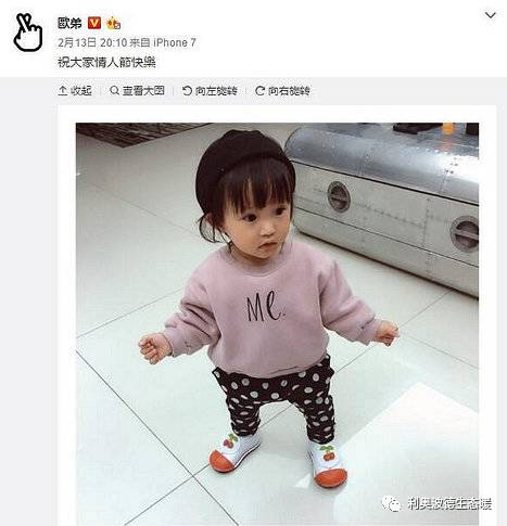 欧弟在微博晒出女儿jojo的萌照,并配文“祝大家情人节快乐!”。照片中,jojo头戴着黑色发箍,身穿淡紫色卫衣配黑白斑点长裤,一双水汪汪的大眼睛十分惹人喜爱。