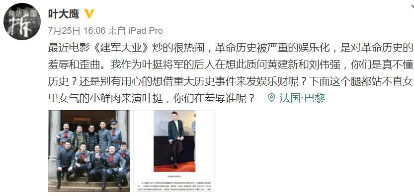 前天叶挺的后人叶大鹰发微博质问电影《建军大业》,“下面这个腿都站不直女里女气的小鲜肉来演叶挺,你们在羞辱谁呢”,一石激起千层浪。
