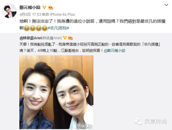 真人秀《非凡搭档》在举办新闻发布会时,郑元畅就主动说起加入这档节目的原因,“很高兴加入非凡搭档,老实说加入这个团体有部分原因是因为依晨也参加了,我和大家一样期待和依晨同框。”