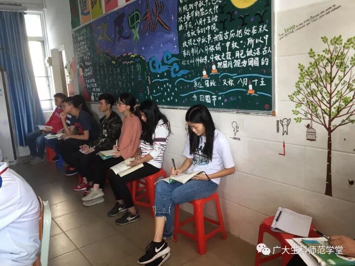 怀揣着期待、兴奋、学习的心情,我们小分队来到了榄核中学,旁听了在这里实习的黄毅森师兄和宋艺彬师兄的授课过程。在听课过程中,毅森师兄对PPT的熟练程度以及讲解的超强逻辑性,层层相扣,加上幽默有趣的课堂语言,让学生们都很好的理解知识点。对于刚训练完讲解技能的我们,这节课无疑是让我们对讲解技能有一个更加透彻的了解。除此之外,艺彬师兄的课堂也是十分的活跃,加上师兄通俗易懂的语言描述,更是让课堂氛围达到了一个顶峰。两种不同风格的课堂,两位师兄的传授,都教会了我们如何更好的掌握教学技能,也给了我们当头一棒。一线教学和我们在校的模拟课堂区别甚远,模拟课堂太过完美,缺乏真实感。而一线教学并不是表面上那么的简单,也让我们不禁深思“如何更好地进行模拟课堂训练”。