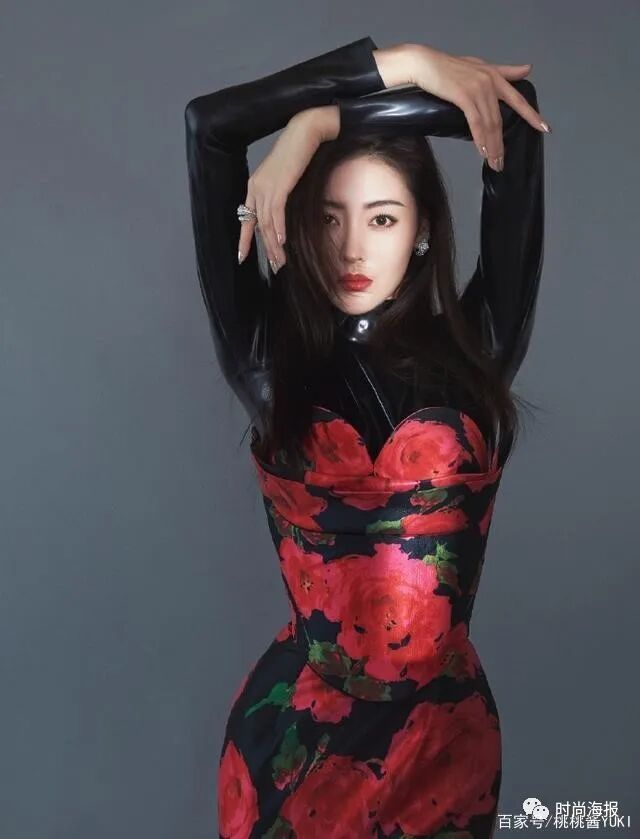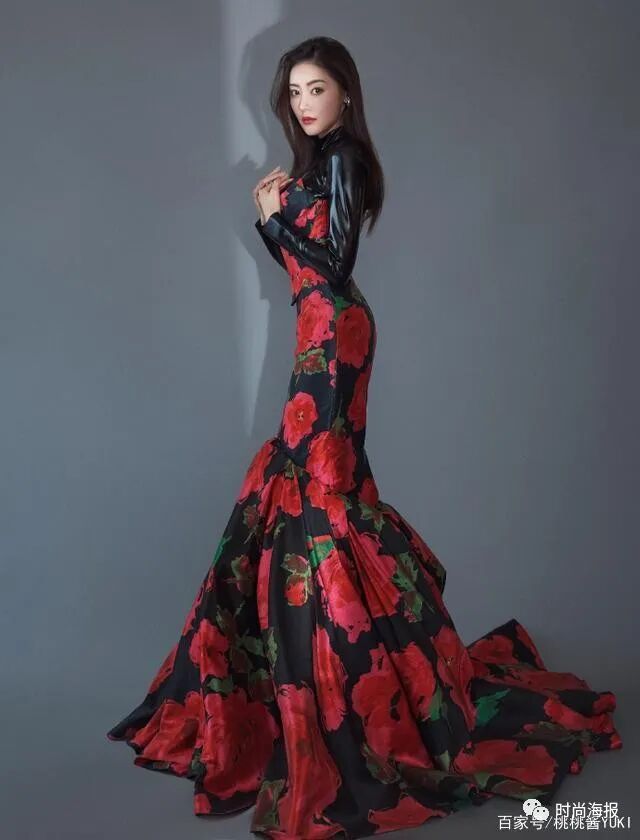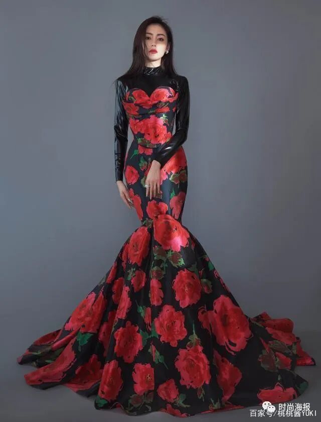 黑底大红花的裙装颜色,令人感到惊艳,但又不失优雅稳重。原本性感动人的抹胸鱼尾裙,却巧妙内搭了一件皮质紧身衣,使得较为常见的抹胸裙瞬间拥有个性时尚感。再加上张天爱挺立的五官轮廓,霸气中展露性感女人味。在配饰的搭配上,挑选了设计简单的带钻耳环与戒指,低调奢华不失高级感。