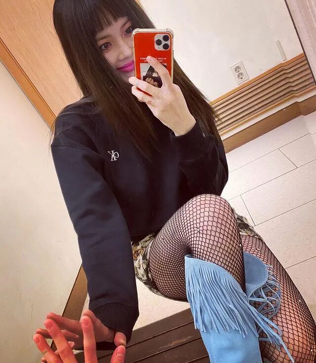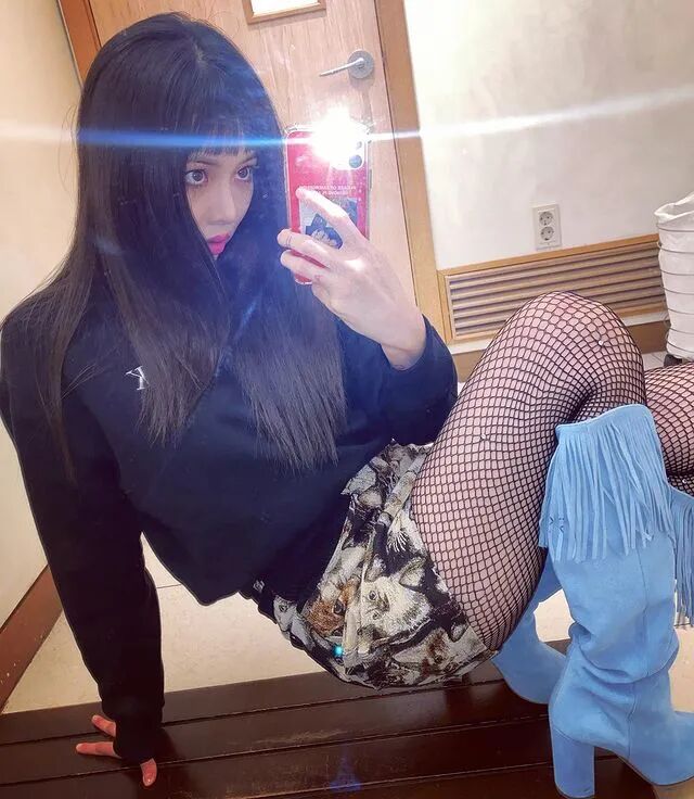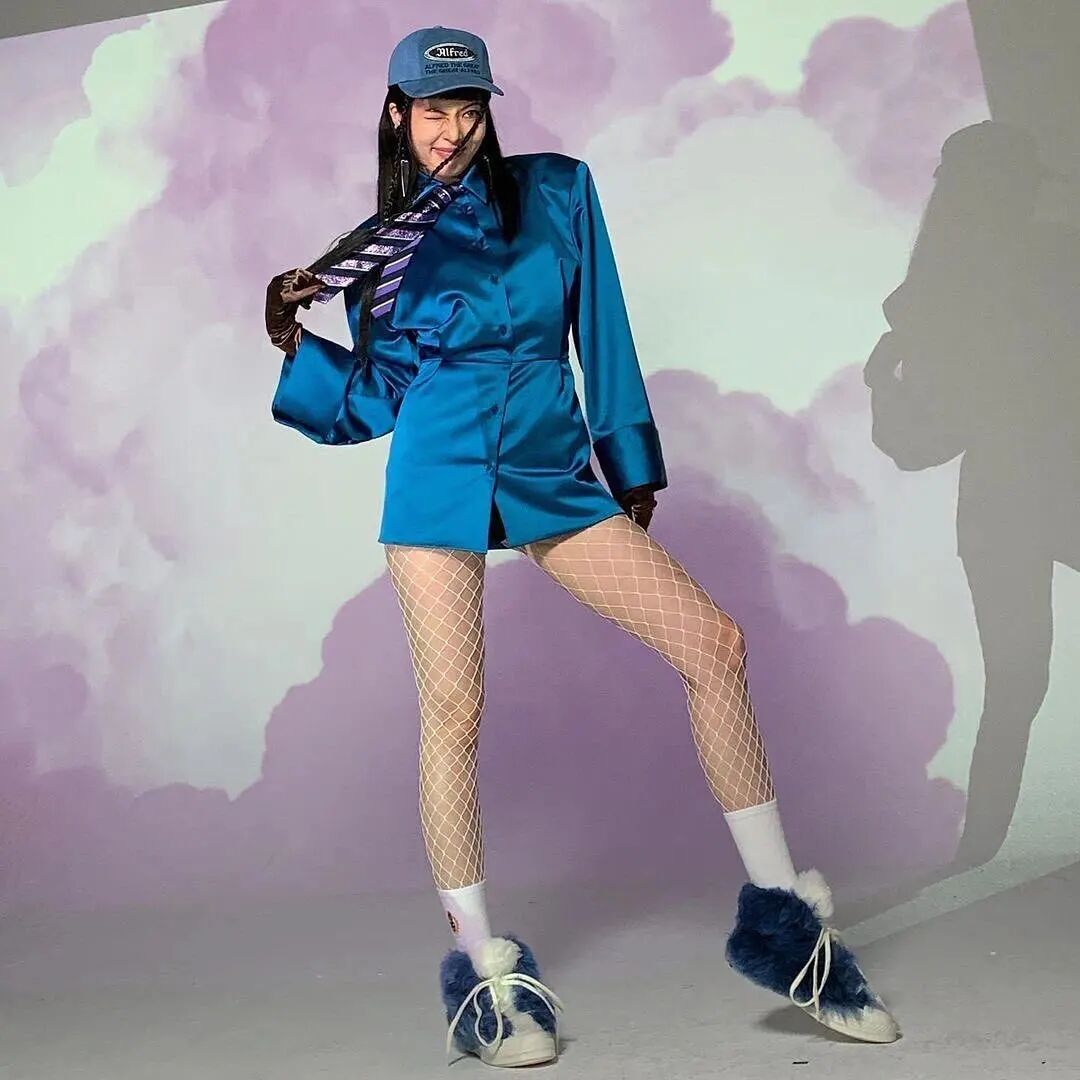 渔网袜本身就足够考验腿型了,再穿一双中筒袜,泫雅可真有你的!反正有大长腿,怎么造作都行。