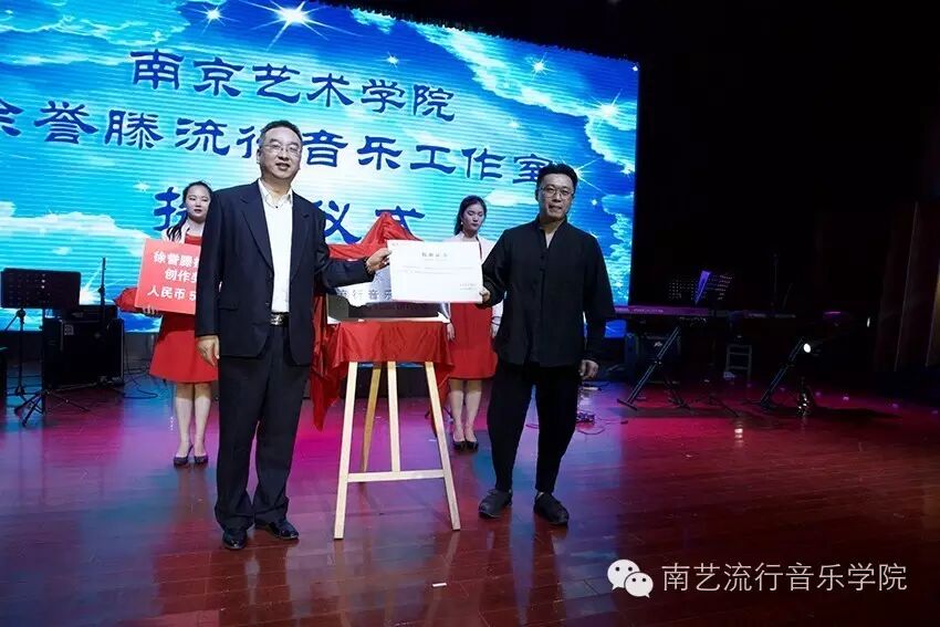 流行音乐学院袁晓虹副院长致辞之后,南京艺术学院两办主任郭峰与徐誉滕先生共同揭牌,“徐誉滕流行音乐工作室”正式成立。徐先生代表天津市金睿天甲影视文化传播有限公司向我院捐赠原创音乐发展基金五万元,我院王东舰书记代表流行音乐学院接收捐赠,南艺发展规划与社会合作办公室主任顾新跃向徐誉滕颁发捐赠证书,随后徐誉滕先生对于工作室的建立以及今后对流行音乐学院原创作品的推广做了发言。