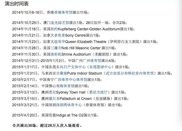 2014年至2015年《唔黐线唔正常》场次表,截图自百度百科,第一行中「香港体育馆」指的是香港红磡体育馆,在此连开11场