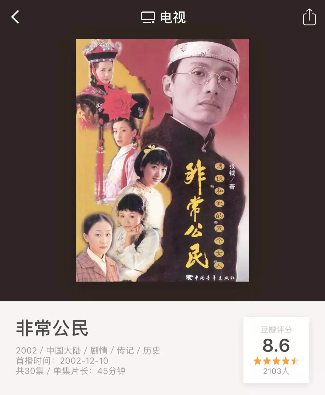 2002年,30集电视连续剧《非常公民》,黄子华饰溥仪,豆瓣评分8.6