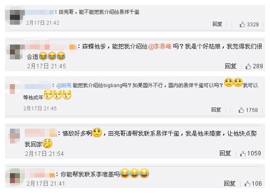 微博一经发出,吸引了各个不同艺人的粉丝前来留言,纷纷希望“田月老”可以帮忙牵线自己的偶像。看来这情人节刚过,大家都对脱单热情不减啊!