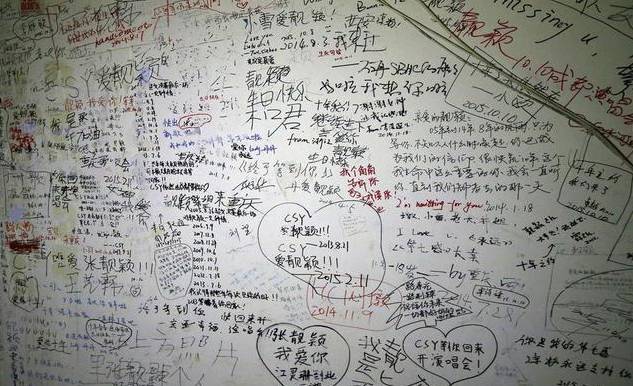 这些密密麻麻的字画,都来自于歌手张靓颖的粉丝。因为这里是张靓颖出名前居住的地方。粉丝留言数量在5楼一处防盗门前达到顶峰——那里是传闻张靓颖居住过的地方。周边的墙上、门上几乎没有地方“幸免”。