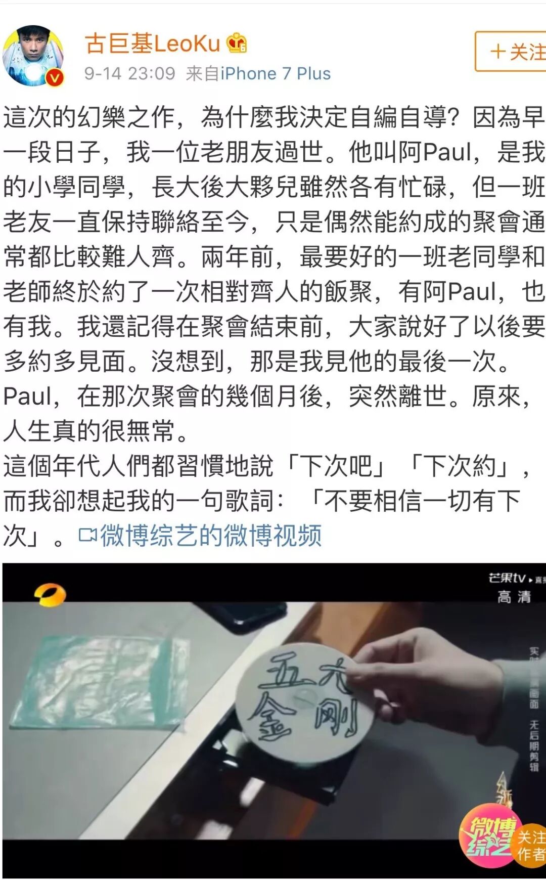 演出前两个久别重逢的昔日老友就格外欣喜,演出结束后沉浸在表演中的古巨基更是久久不能平静。