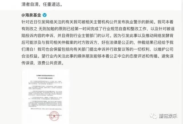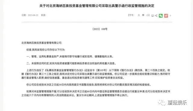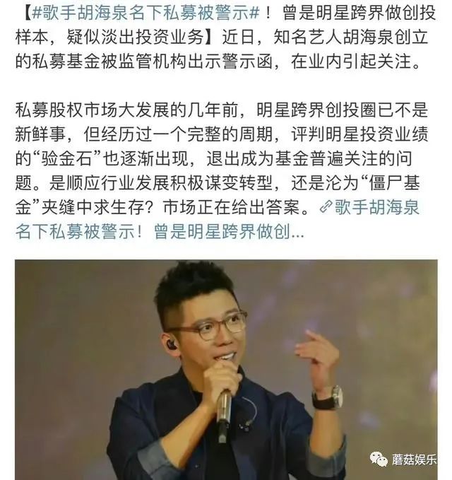 近日,知名歌手胡海泉被爆出多项违规,让其沉寂已久的事业再次陷入低谷。据报道,胡海泉名下的私募公司北京海纳百泉投资基金管理有限公司因多项违规行为,收到了来自北京证监局的警示函。