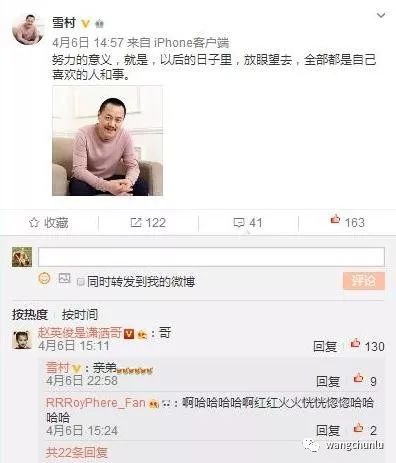 一直以来,两人都因为长相相似而被观众网友指认是亲兄弟,常常被观众认错。当天雪村在微博配图并发文称“努力的意义,就是,以后的日子里,放眼望去,全部都是自己喜欢的人和事。 ”结果赵英俊在微博下面回复道:“哥”。雪村也随即互动“亲弟”。逗趣互动引发网友关注,网友纷纷回复:“两个人都太可爱了!”