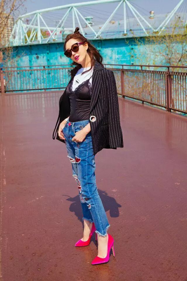 杜若溪丸子头青春少女感,古驰黑超遮面,红唇加持,很有时尚摩登女郎范。蕾丝内衣外穿,内搭白色T恤,外穿条纹西装,休闲,性感,女人味,中性化各种风格混搭,既不会过于妖艳性感又不会太过硬朗,整体感觉很棒!