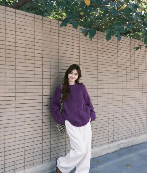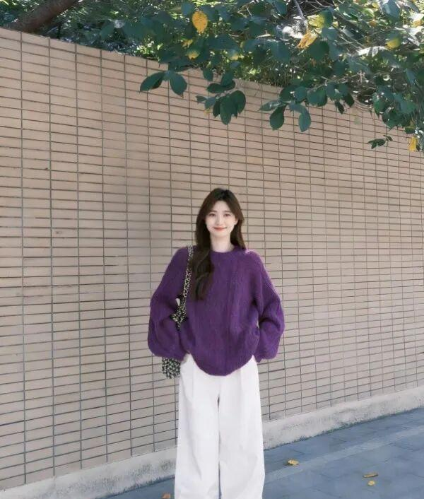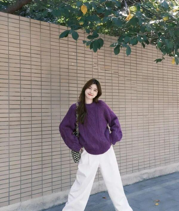 最后我发现,同样是紫毛衣+白阔腿裤,换双鞋就是两种人格。踩双帆布鞋或平底乐福鞋,是文艺松弛的日常感;换成带点跟的踝靴或穆勒鞋,哪怕只是3厘米,整个人的姿态会立刻被“提”起来,变成可以去咖啡馆见朋友、甚至应付一些非正式工作场合的打扮。? 这大概就是基础公式的妙处,它给了你一个不会出错的底色,至于想渲染什么情绪,换双鞋就能办到。