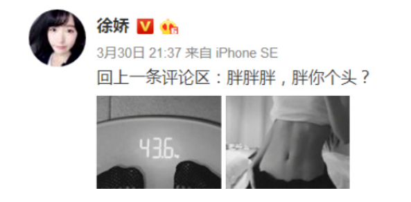 但徐娇从来都是不好惹的,很快她就追加了一条微博,秀出了马甲线和体重,霸气地回复道:“胖胖胖,胖你个头!”
