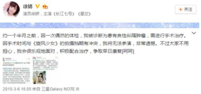 2015年,徐娇患上了纵隔肿瘤,因为手术时间和《旋风少女》的拍摄档期有冲突,她遗憾地错过了这次参演。