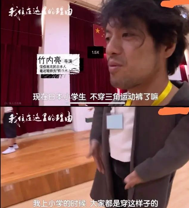 竹内亮表示,他很喜欢这样的穿着,又说现在的小学生已经不穿三角形状的运动裤了,为此,他觉得“特别可惜”。
