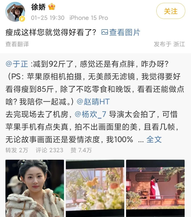 就在今年一月,徐娇在网上怒怼了导演于正。原因是于正发微博说女演员赵晴减到了92斤,可他还是觉得有点胖。