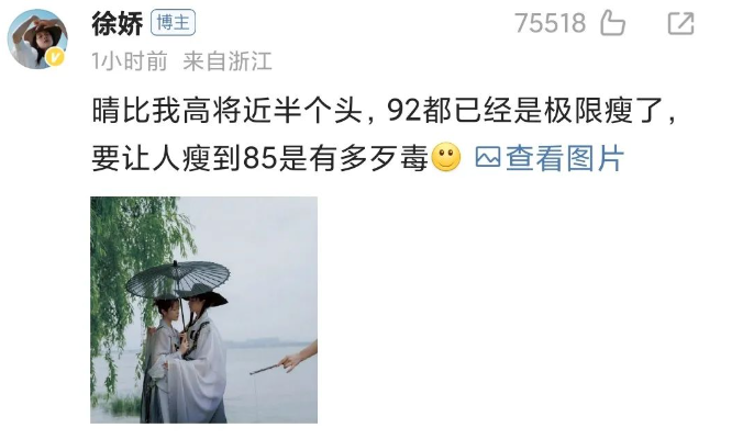 徐娇就发微博吐槽:赵晴都比我高将近半个头了,92都已经是极限瘦了,要让人瘦到85斤是有多歹毒!