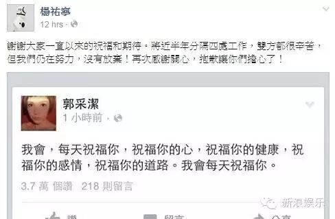 在今年3月15日,郭采洁在微博上发文写下:“我会,每天祝福你,祝福你的心,祝福你的健康,祝福你的感情,祝福你的道路。我会每天祝福你”