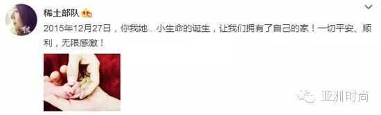 章子怡在微博中写道:“2015年12月27日,你我她…小生命的诞生,让我们拥有了自己的家!一切平安、顺利,无限感激!”