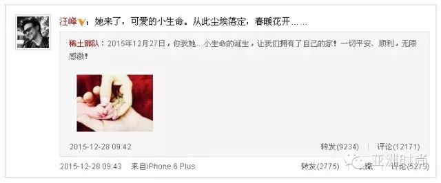 随后,汪峰转发了章子怡的微博,并附文道:“她来了,可爱的小生命。从此尘埃落定,春暖花开……”
