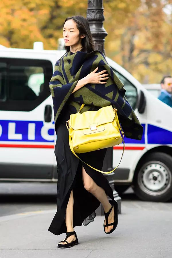 有没有发现,孙菲菲其实偏爱素色时装,这时候一只色彩亮丽的包包就必不可少,当然也要考虑实用性。比如像这种大容量手袋,既能手提又能单肩背,柠檬黄色轻松赢得关注。