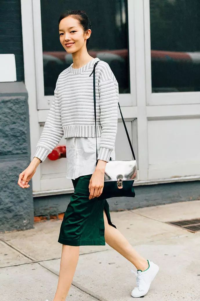 质地柔软的针织衫本来就给人亲和的印象,搭配半裙增加女性气质。但孙菲菲从来不会用犀利高跟鞋来搭这一身,她大多会选择舒适的球鞋,或是根据整体造型搭一双乐福鞋。这当然与她的身高有关,不过更重要的是穿平底鞋容易营造自然不造作的休闲感。