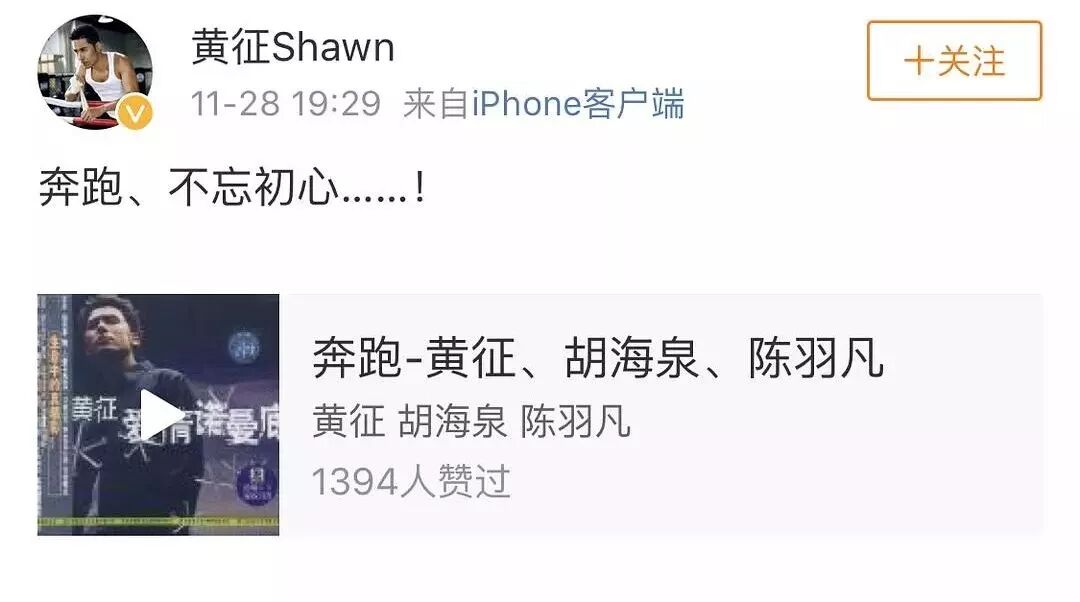 在羽凡因为吸毒被抓,羽泉演唱会也搁置后,黄征发了一条微博,分享《奔跑》这首和羽泉合作的歌,似乎意有所指。