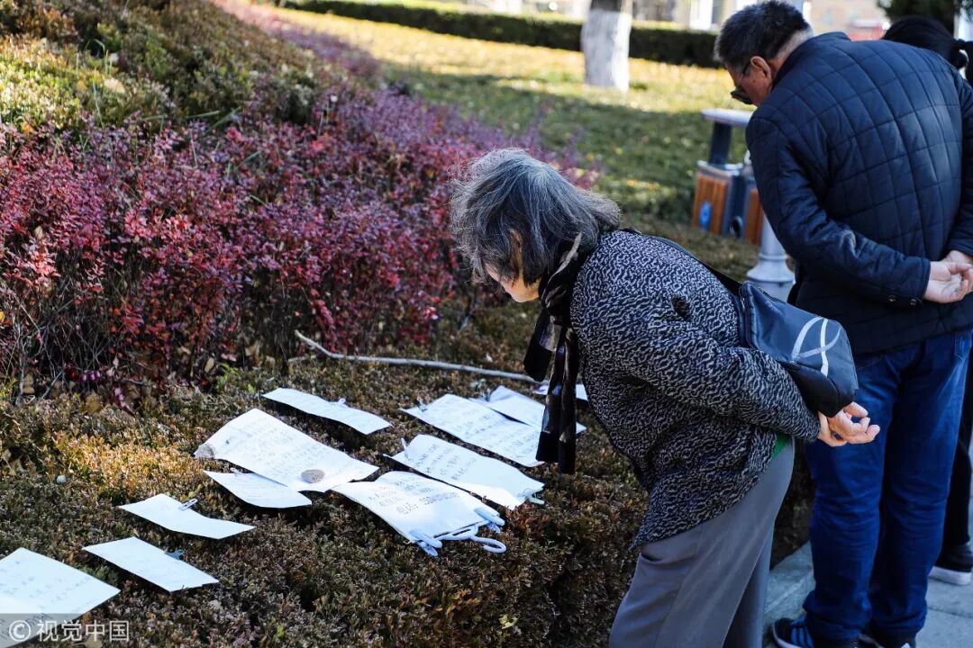 辽宁丹东,锦江山公园相亲角,来为儿女找对象的家长在浏览灌木丛上的信息 / 视觉中国