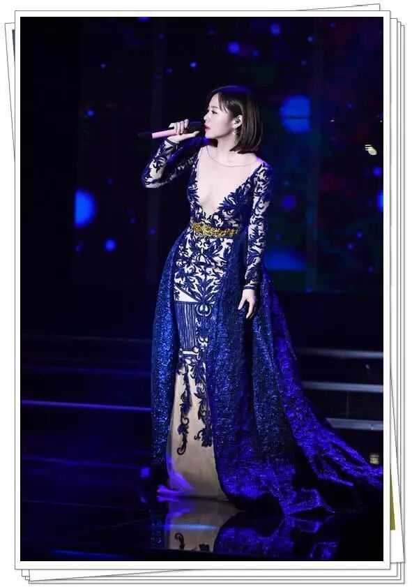 张靓颖宝蓝色的礼服裙搭配上短发看起来非常的有气场,蓬松的裙摆搭配上精致的花纹让张靓颖有更强的精致感。