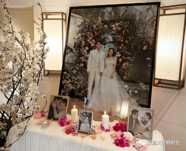 在婚礼现场布置的礼桌上还摆满了孙艺珍与玄彬的照片,一些鲜花散落在周围,氛围显得甜蜜又温馨。