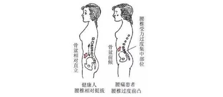 正常人在站立时,腰椎挺拔,骨盆相对直立;而骨盆前倾者则会出现脊椎过度弯曲,腰椎前凸。