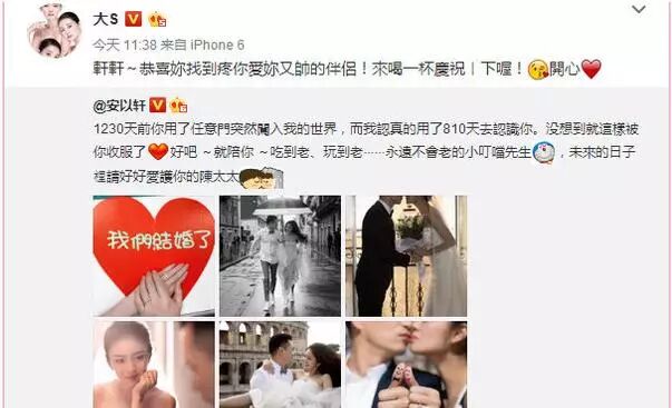 娱乐圈内人脉一向很好的安以轩也接到了众多无法到场明星的微博祝福,这其中,昔日情敌大S的祝福却显得又酸又尴尬。