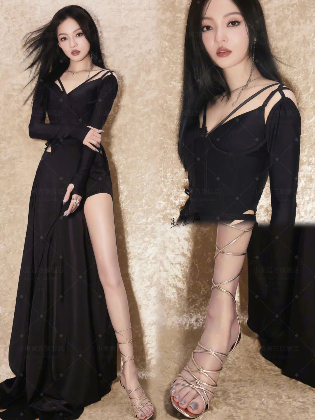 转瞬间,舞台灯光骤暗。她身着鎏金暗纹的黑色礼服踏着鼓点走来,高开衩裙摆下若隐若现的绑带凉鞋,每一步都踩在观众的心跳上。当她抬眸的刹那,眼尾的暗红色眼影如同血色玫瑰绽放,指尖缠绕的金属链条随着歌声甩出凌厉弧线。此刻的"暗黑女王"不再是形容词,而是具象化的气场结界,让空气都凝结成冰晶。