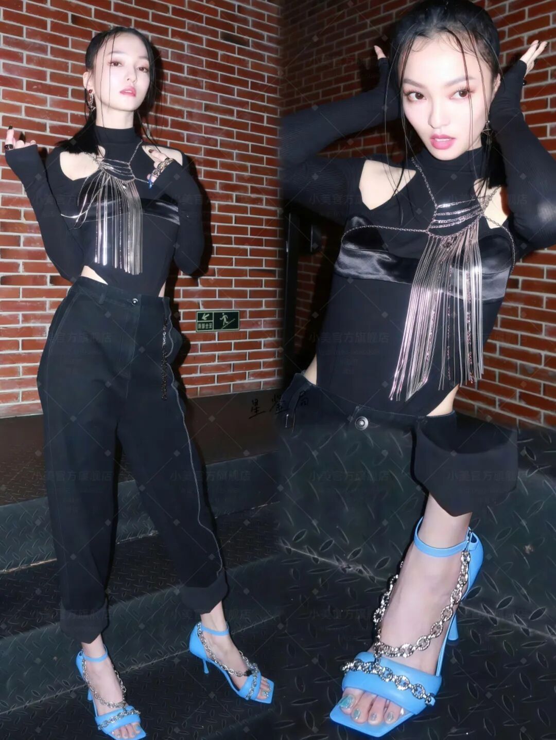 突然间,电子音效炸裂全场。她化身赛博朋克女战士,解构主义设计的露背上衣镶嵌着冷光链条,破洞牛仔裤的金属铆钉与脚踝处的荧光绑带形成未来感呼应。当她随着节奏甩动缀满铆钉的皮夹克,那些被称作"叛逆"的元素瞬间化作时尚圣经——原来个性从不需要定义,它本身就是最锋利的武器。