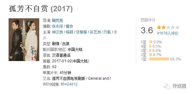 春节破冰IP剧的《孤芳不自赏》在《三生三世》播出追赶之前,本是2017年IP市场的第一高潮,不负众望地席卷收视榜单,开播后期间34天位居各大省级卫视同黄金时段第一,平均收视率1.224%,当时寒假的热度飙超《三生三世》,霸榜电视剧的第一关注度,单日最高关注度为0.6125%,实时关注度最高超过0.88%,更别说甩了鼻祖CCTV好几个街区。