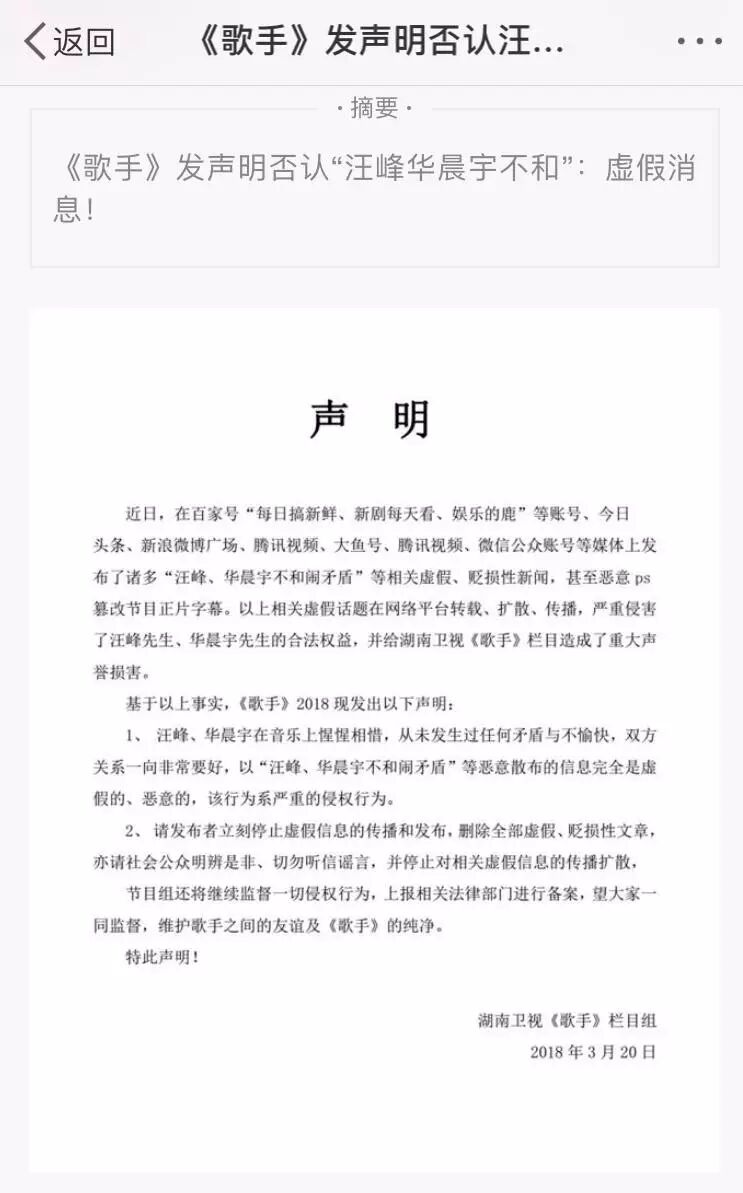尽管两位当事人在事后纷纷发表声明进行澄清,用调侃方式否认俩人吵架、不和的传言。《歌手》在官方微博同时也发出声明否认汪峰、华晨宇不和。大家都应该知道。谣言不可能是空穴来风的,事出肯定有因。据知情人透露,汪峰与华晨宇不和早就不和了,此次事件仅仅是个引爆点。他们之间竟是因为