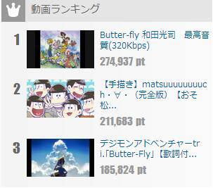《butter-fly》也瞬间登上了Niconico动画排行榜第一。