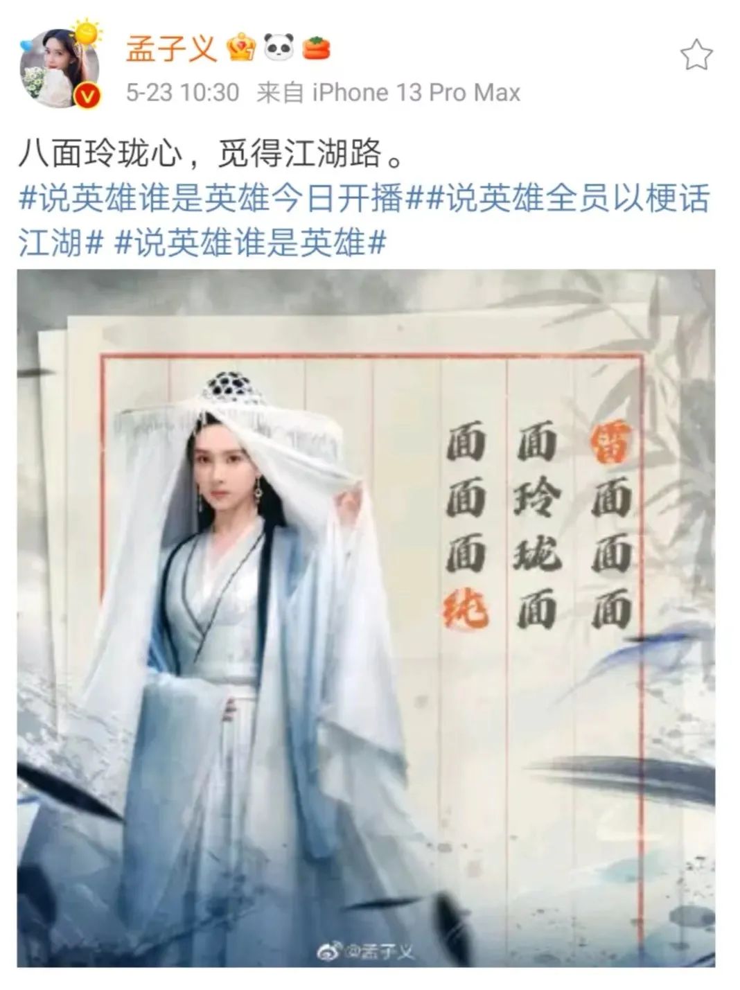 用了自己一袭白衣的古装造型,她配文说:“八面玲珑心,觅得江湖路。”当然一眼能看出,她是在给自己刚刚开播的新剧《说英雄谁是英雄》造势。这部剧改编自温瑞安的同名小说,孟子义在里头扮演六分半堂堂主的女儿雷纯。