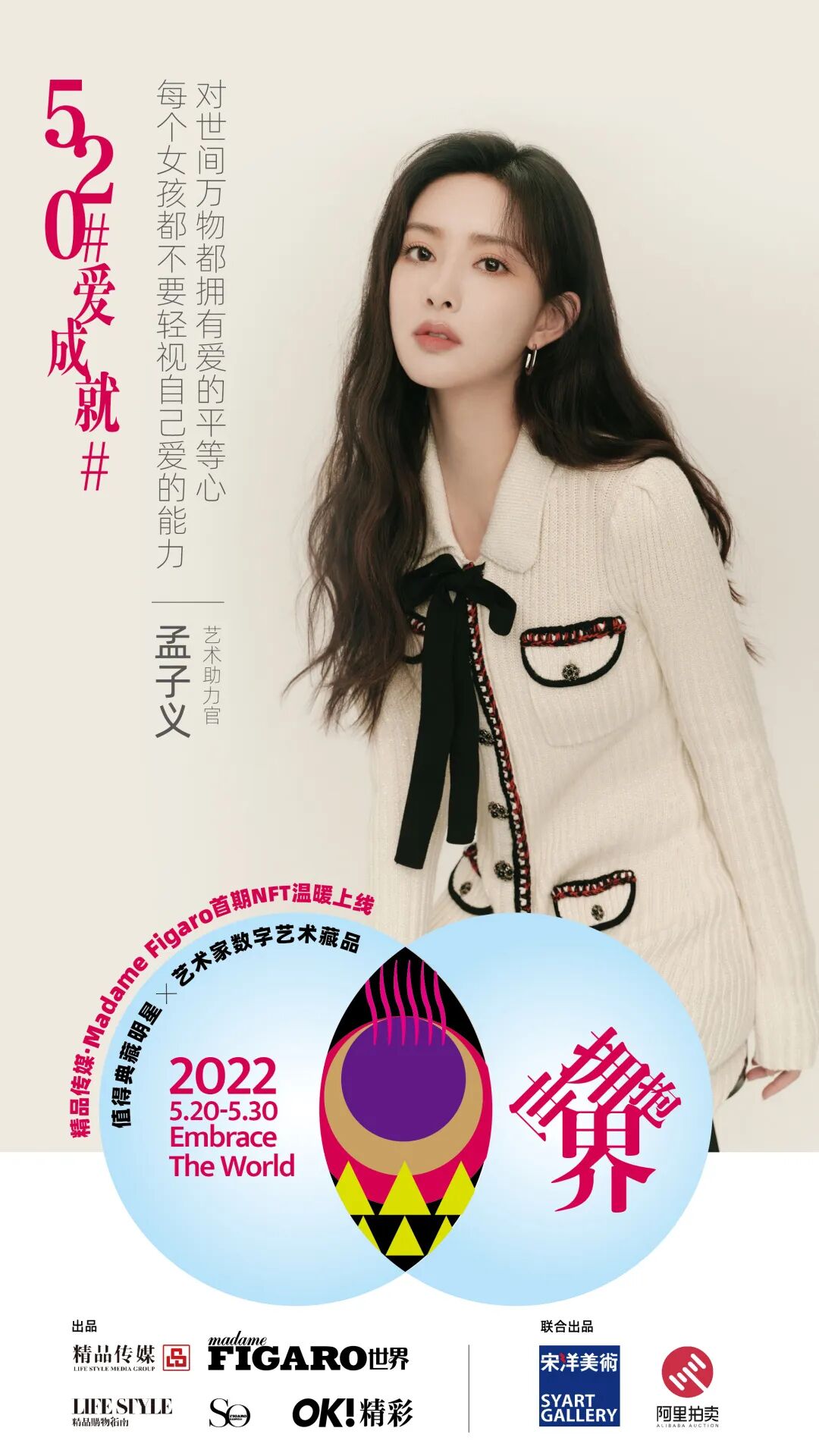 最近,孟子义参加了精品传媒·Madame Figaro发起的“拥抱世界”数字艺术计划。6位明星黄圣依、柳岩、吉克隽逸、孟子义、陈楚生、李乃文,携手6位艺术家芒克、谭平、蔡志松、彭薇、宋洋、祁志龙,一起跨界合作,联合推出了风头正劲的NFT数字艺术藏品。