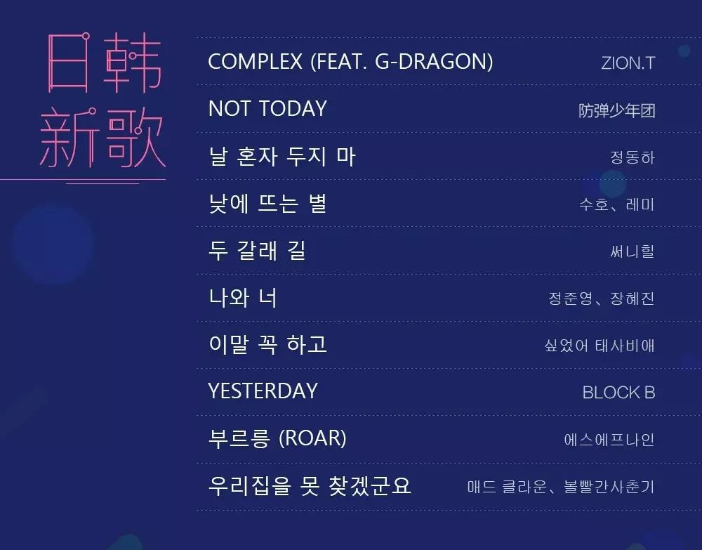 各位VIP肯定最近都沉迷在GD参与的《Complex》,不过也别忘了防弹少年团的《NOT TODAY》,还有EXO成员SUHO(金俊勉)和歌手REMI演唱的韩剧《宇宙之星》OST,两人的完美和音也是不能错过的哟。